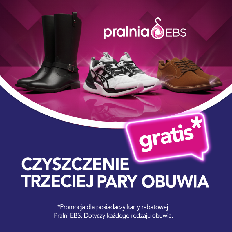 Od 1 grudnia 2025 do 15 stycznia 2026 trwa promocja: przy oddaniu minimum 3 par butów trzecia para (najtańsza) jest czyszczona gratis z kartą rabatową Pralni EBS.