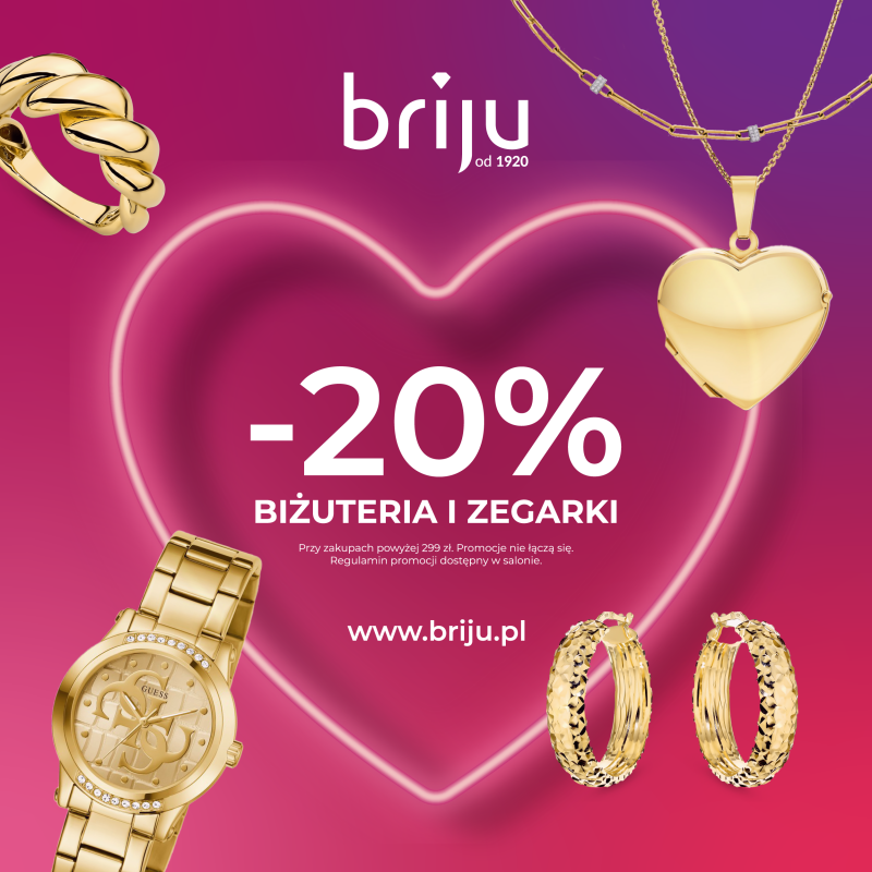 Walentynkowy rabat –20% na biżuterię i zegarki w Briju przy zakupach powyżej 299 zł dla Klientów Programu Lojalnościowego.